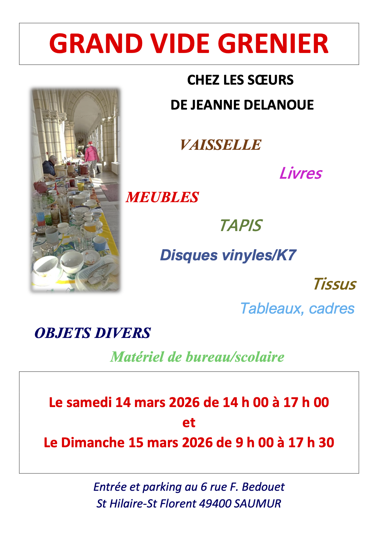 Les Sœurs de Jeanne Delanoue organisent un GRAND VIDE GRENIER dans leurs